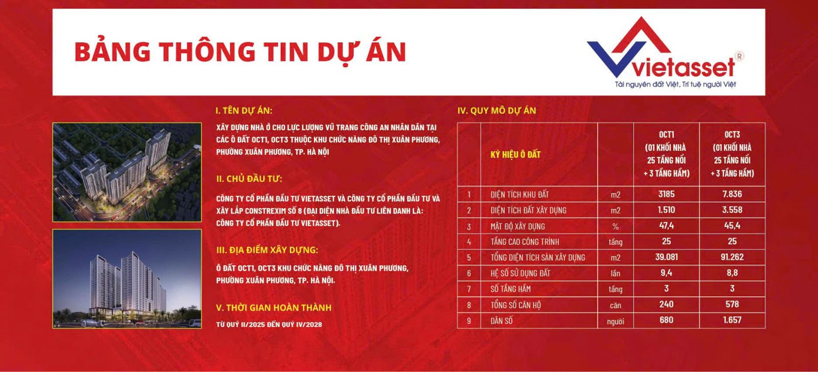 2. Chủ đầu tư: CÔNG TY CỔ PHẦN ĐẦU TƯ VIETASSET (ĐẠI DIỆN NHÀ ĐẦU TƯ LIÊN DANH CÔNG TY CỔ PHẦN VIETASSET VÀ CÔNG TY CỔ PHẦN ĐẦU TƯ VÀ XÂY LẮP CONSTREXIM SỐ 8)