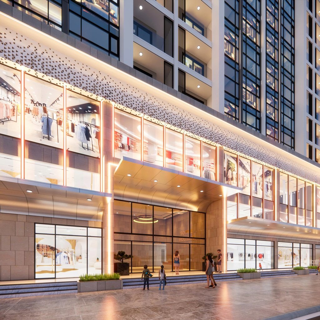 Khối đế 3 tầng: bố trí các chức năng thương mại, dịch vụ, thể dục thể thao, nhà trẻ và sinh hoạt cộng đồng