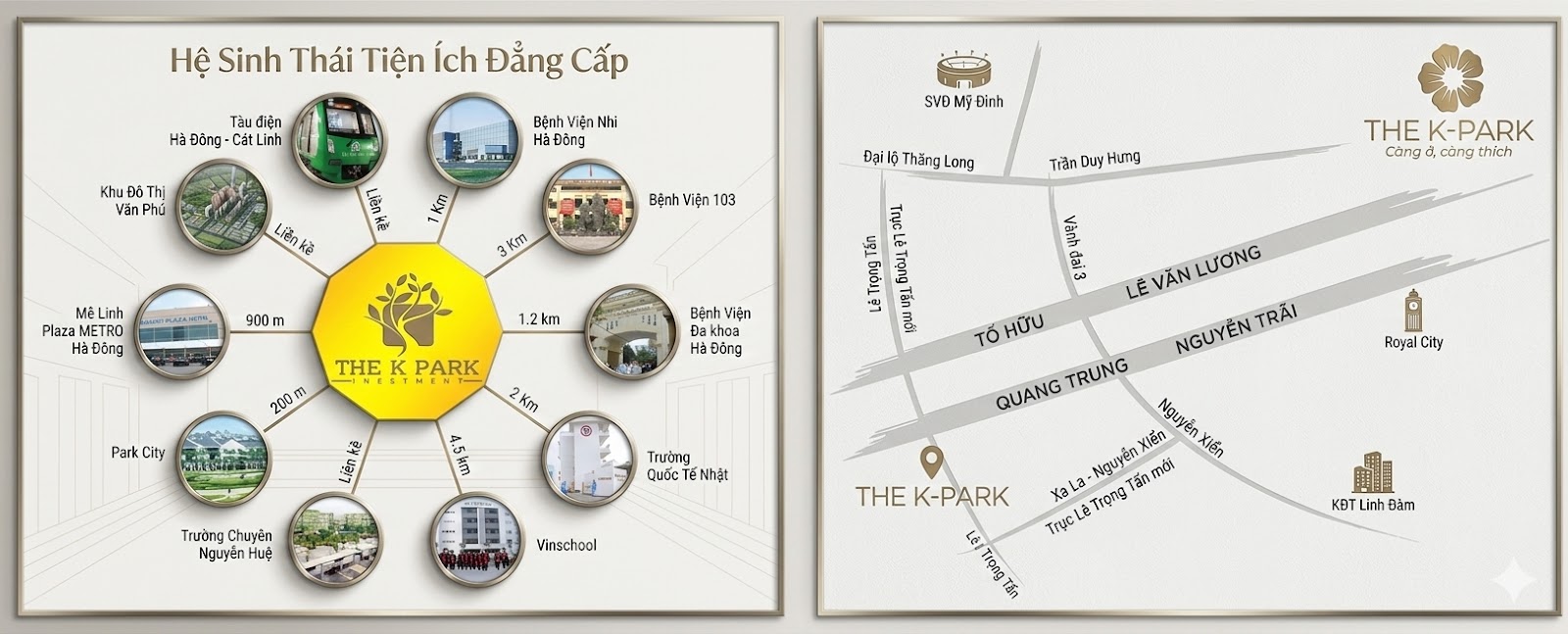 The K Park là tổ hợp căn hộ cao cấp nằm tại Khu đô thị Văn Phú, Hà Đông, được quy hoạch đồng bộ theo phong cách hiện đại bởi đối tác Hàn Quốc. Dự án bao gồm các tòa căn hộ cao tầng cùng hệ thống tiện ích nội khu hoàn chỉnh, mang đến môi trường sống tiện nghi và kết nối thuận lợi tới trung tâm Hà Nội.